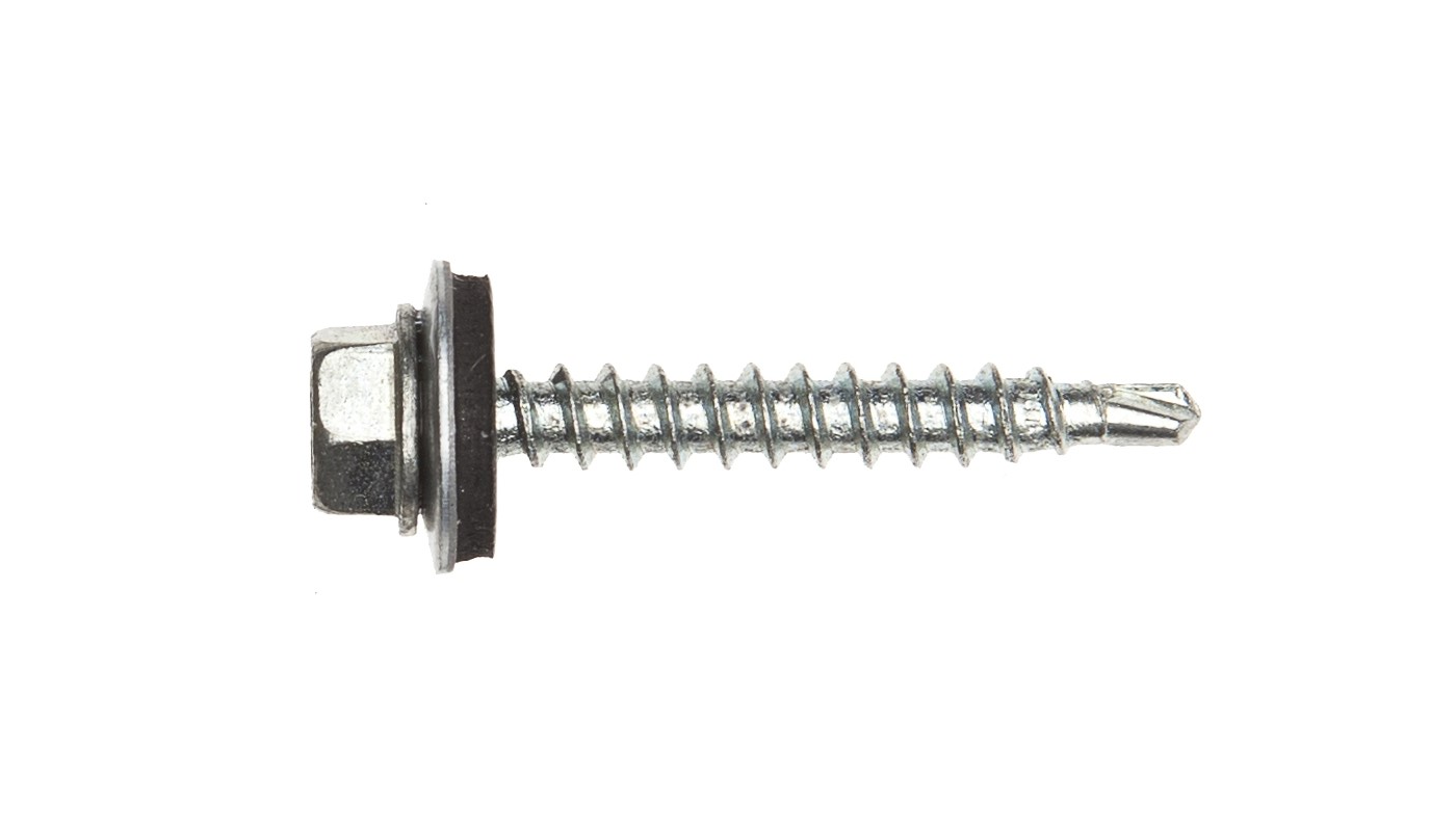 Plateskrue (farmerskrue) for innfestning av plate til treunderlag. Tetningsbrikke med EPDM-gummi.